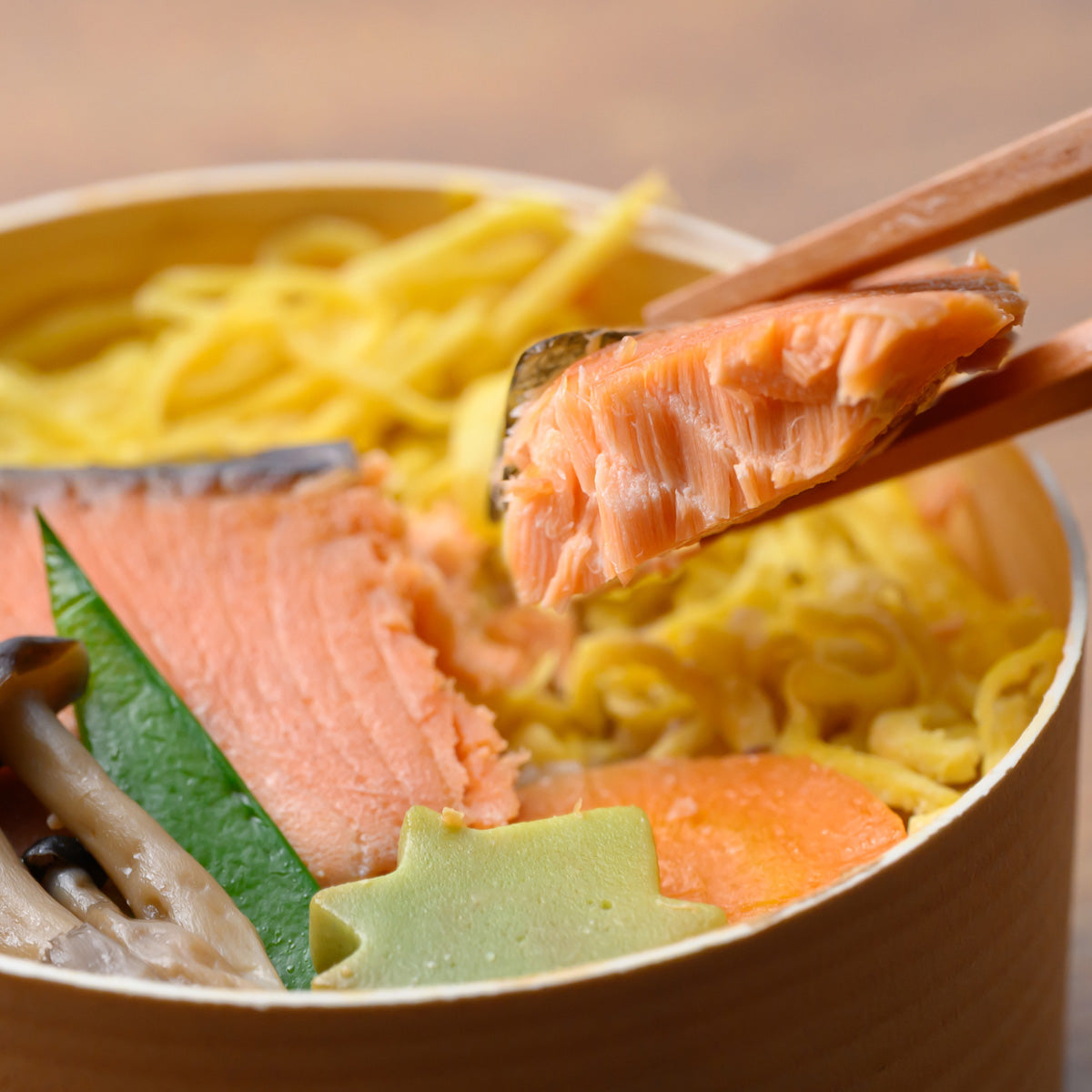 色とりどりの食材は、見た目にも楽しく、美味しさをより一層引き立てます。それぞれの食材が持つ自然な色を活かし、和食文化の美意識をそのままに、美しく盛り付けしております。目にも楽しい京わっぱの魅力的をぜひご堪能ください。