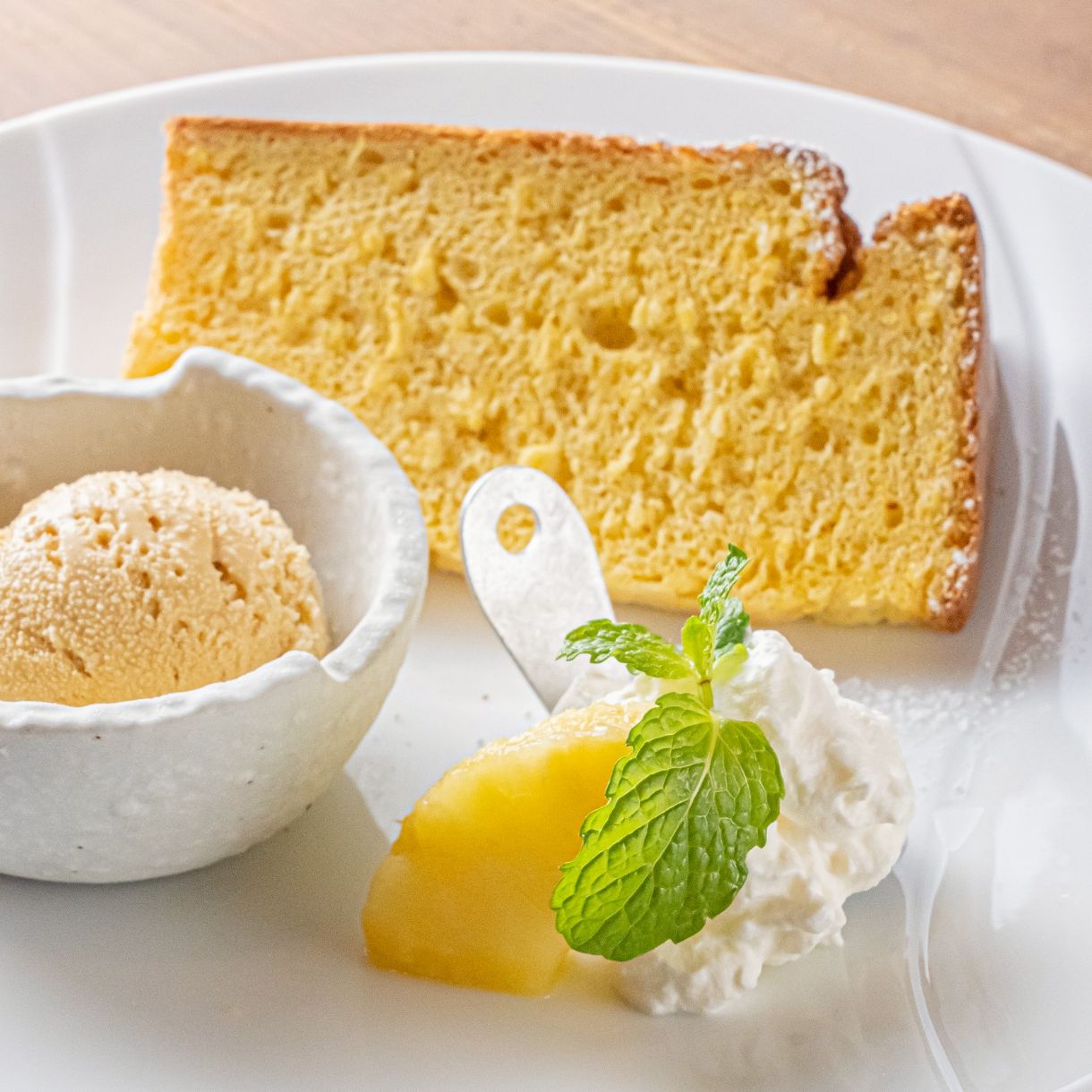 ふんわりと焼き上げたシフォンに、なめらかな自家製クリームと旬の果物を添えて。ここでしか味わえない、心ほどけるひと皿をお楽しみいただけます。