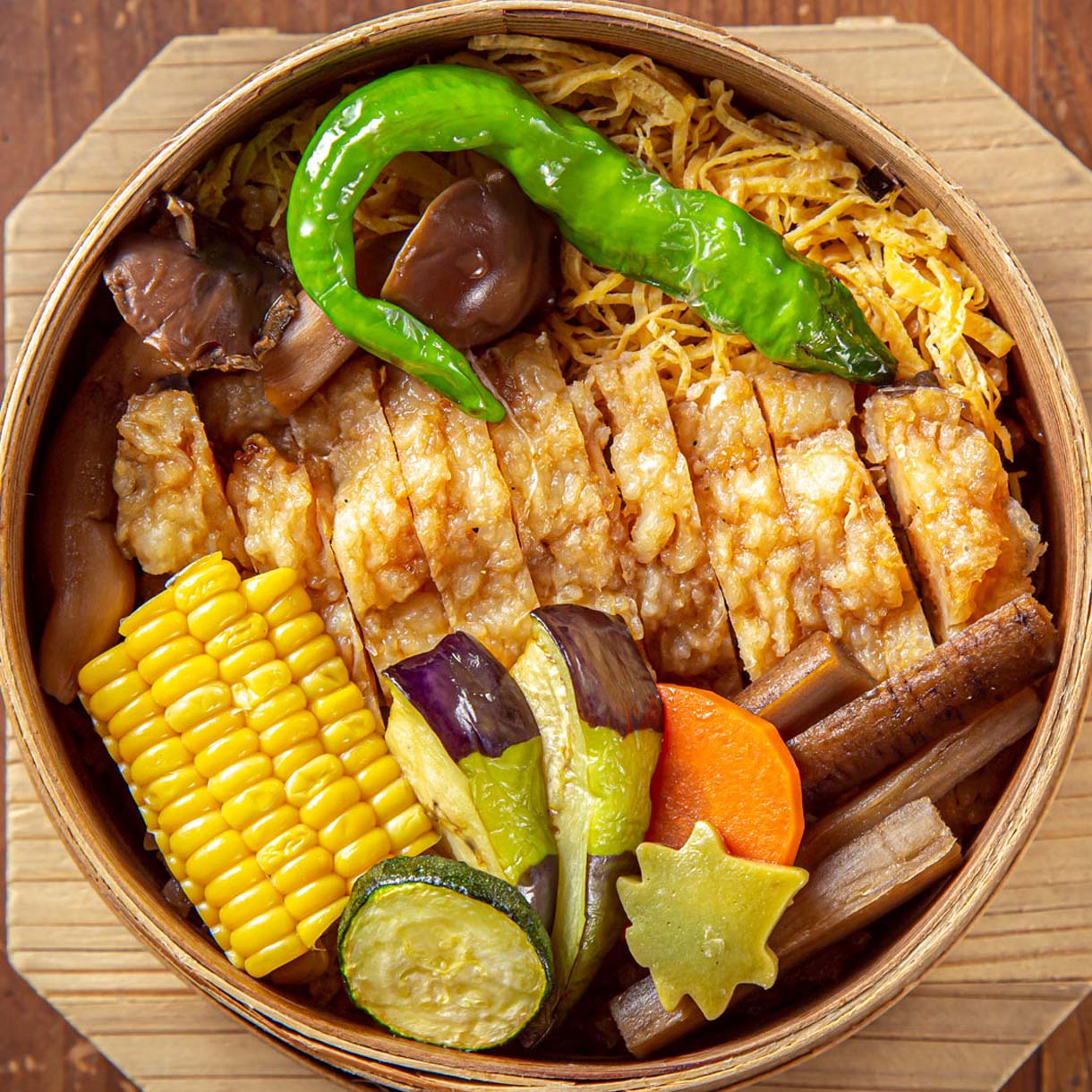 色とりどりの食材は、見た目にも楽しく、美味しさをより一層引き立てます。それぞれの食材が持つ自然な色を活かし、和食文化の美意識をそのままに、美しく盛り付けしております。目にも楽しい京わっぱの魅力的をぜひご堪能ください。