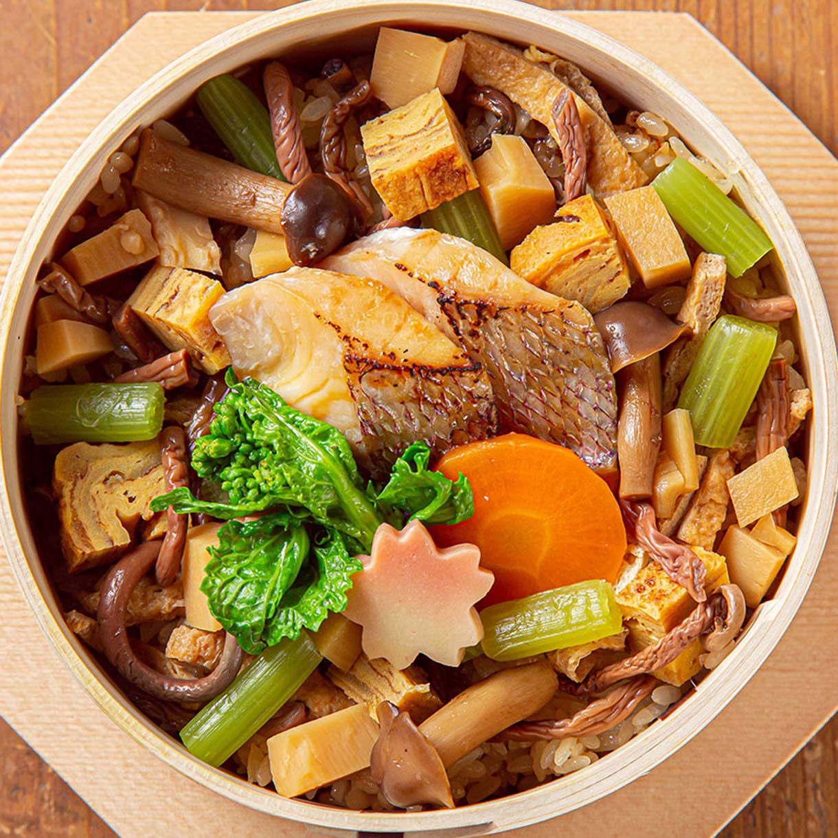原材料名: 栽培期間、化学農薬・化学肥料不使用 うるち米・もち米(京都産)、桜鯛、天然醸造醤油(非遺伝子組替国産大豆、国産小麦粉、塩)、発酵調味料(国産)、素焚糖、筍(国産)、しめじ(国産)、にんじん(国産)、卵(徳島産、PHF・NON-GMO飼料卵)、半兵衛麩(京都産)、青み野菜(国産)、昆布(北海道産)、鰯・鯖・鰹削り節、(材料の一部に小麦、大豆、牛肉を含む)
