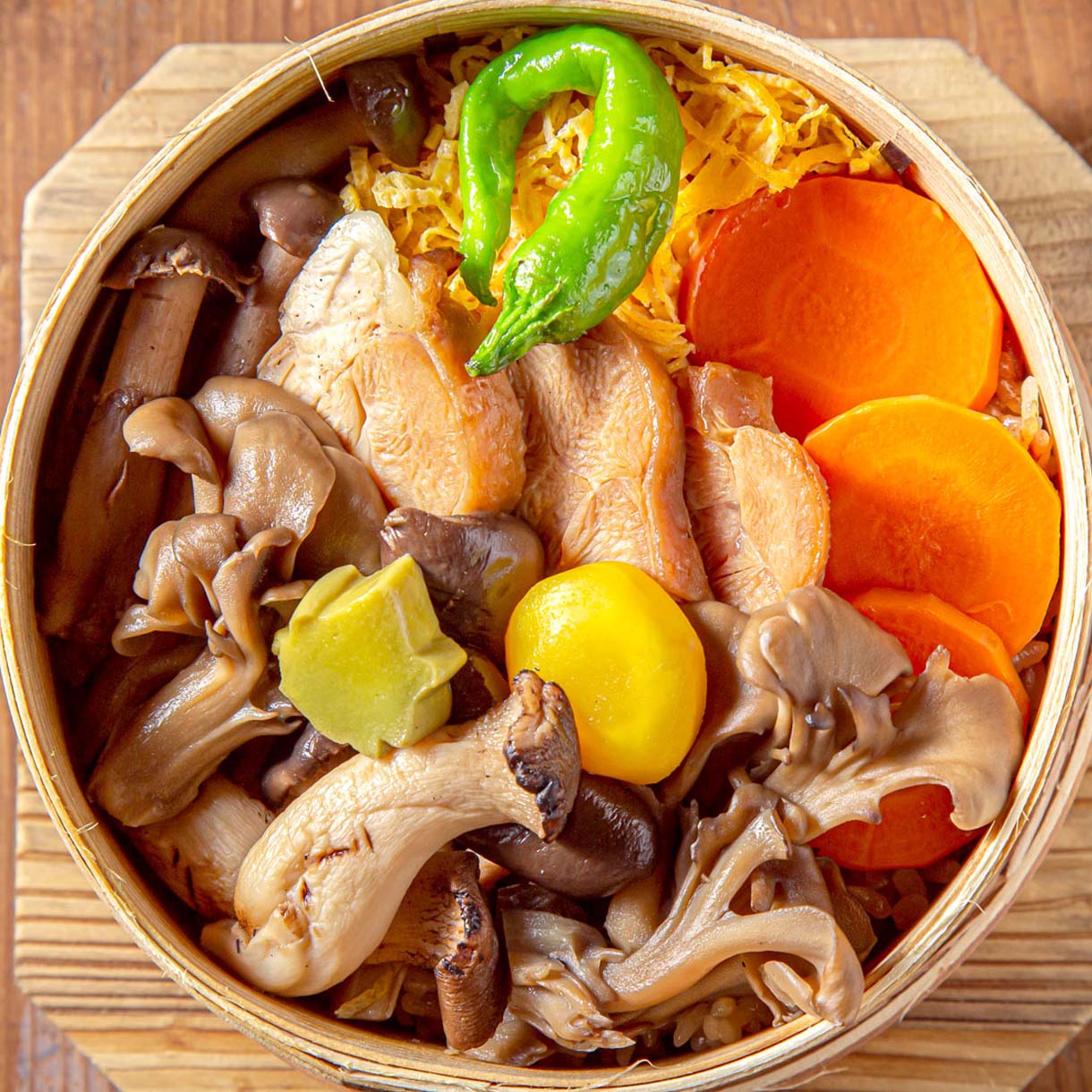 原材料名: 栽培期間、化学農薬・化学肥料不使用 うるち米・もち米(京都府産)、鶏のモモ肉(国産)、天然醸造醤油(非遺伝子組替国産大豆、国産小麦粉、塩)、発酵調味料(国産)、素焚糖、しめじ(国産)、舞茸(国産)、椎茸(国産)、平茸(国産)、栗、にんじん(国産)、卵(徳島産、PHF・NON-GMO飼料卵)、半兵衛麩(京都産)、青み野菜(国産)、昆布(北海道産)、鰯・鯖・鰹削り節、(材料の一部に小麦、大豆、牛肉を含む)
